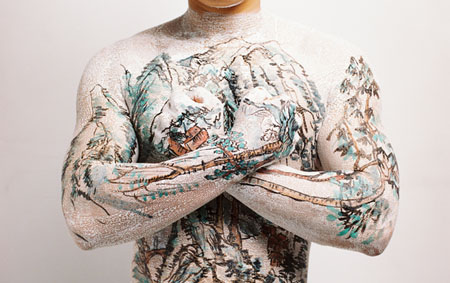 [Image: Landscape on skin, by Huang Yan, from the East Link Gallery, Shanghai; via The Economist. Now we just need someone covered in architectural diagrams, or sea charts… maps of faultlines… stars…].