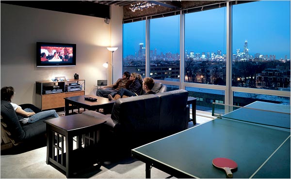 The N.Y. Times then takes a look at crazy dorm rooms – most notably at DePaul University, in Chicago – where students can expect “loft- and villa-like settings, private bedrooms and baths, professional-style kitchens with granite countertops, weekly housecleaning services, plasma-screen TVs, wireless and high-speed Internet connections in every room, fitness centers, swimming pools, even hot tubs and tanning booths.” All of which differs rather fantastically from my own experience of dorm life, which involved living on the 9th floor of a 10-floor high-rise called “Hinton James,” with a roommate who drank huge amounts of Mountain Dew till nearly one o’clock every morning, had a poster of Top Gun above his bed, and wanted to run for President.