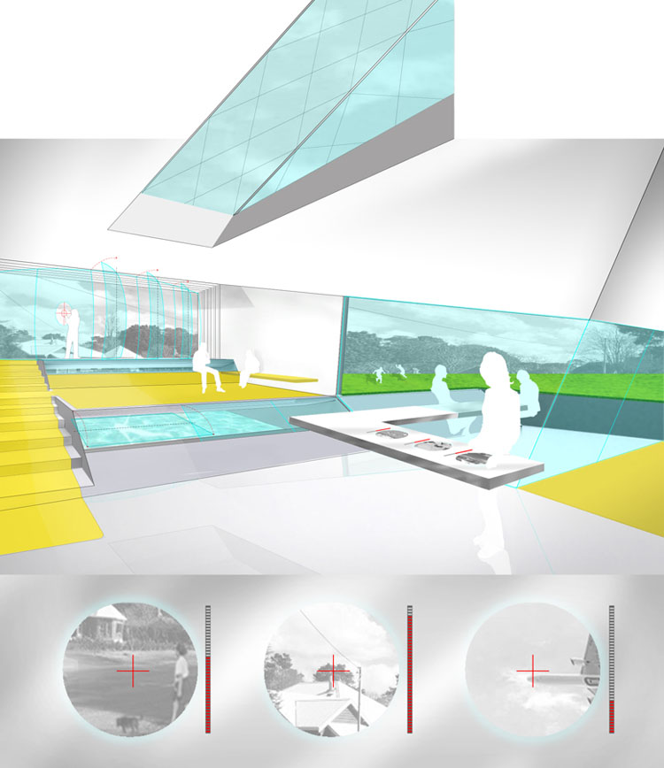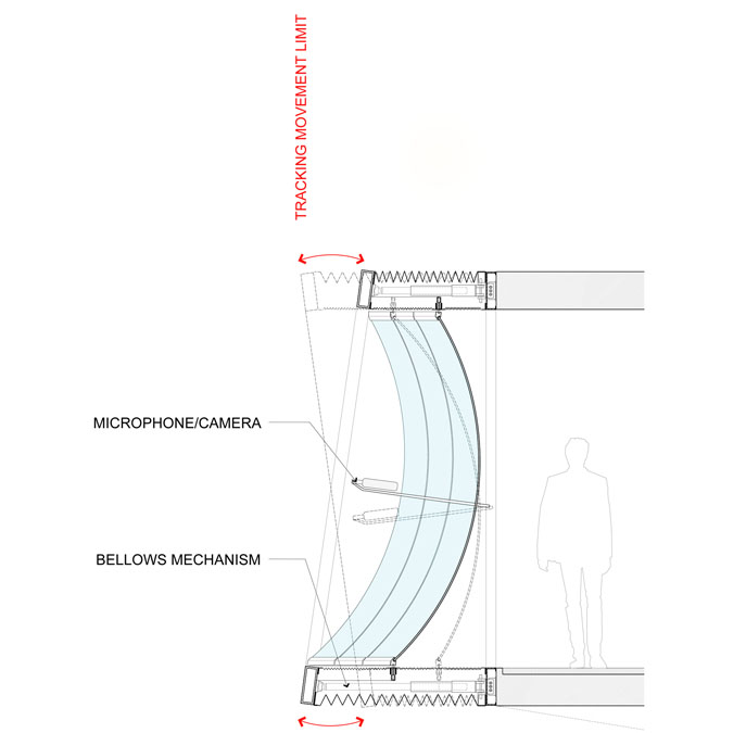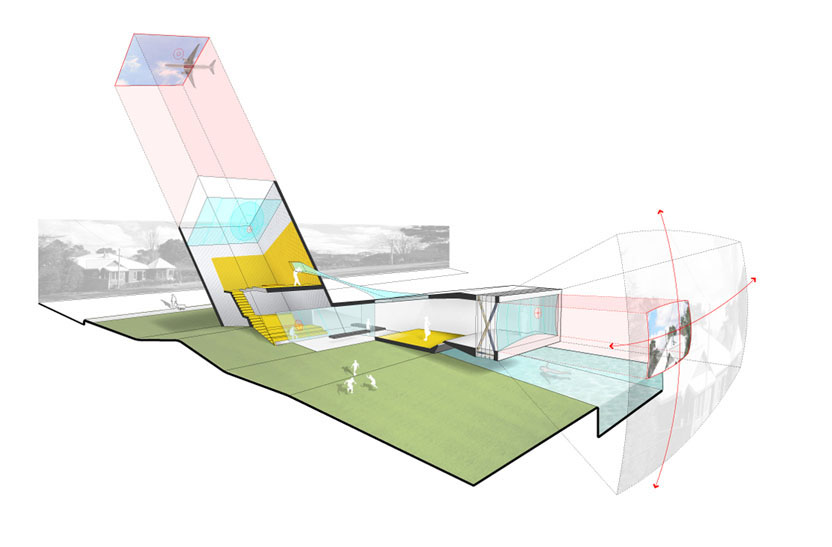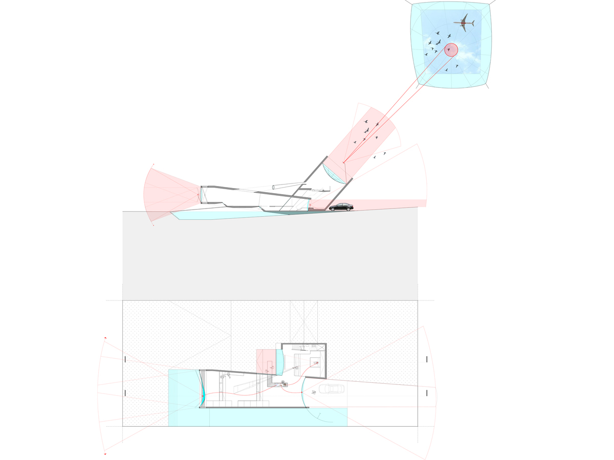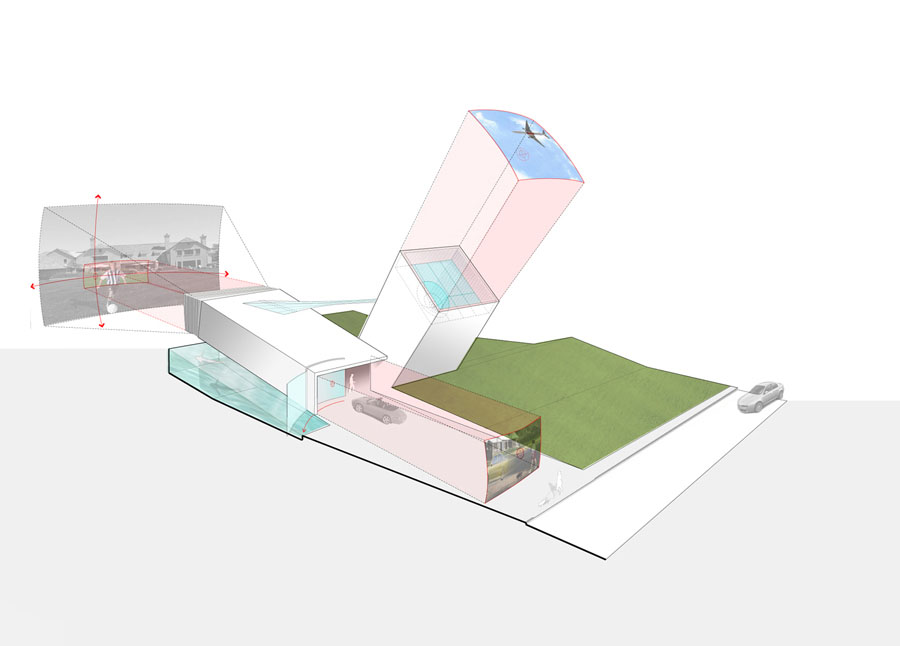 Situated on a generic suburban plot, the dwelling is composed of two sound-gathering volumes outfitted with three audiovisual windows. The curved profile of each of these sonic windows is composed of two elements: a louvered glass window wall that regulates the sound of the air-borne ambient environment, and a parabolic dish that electronically targets domestic sounds and transmits them to an interior audio system controlled from the kitchen island. From this sound command center of the house, occupants are free to design original domestic soundscapes by mixing media sponsored sounds with the ambient noises of the neighborhood.