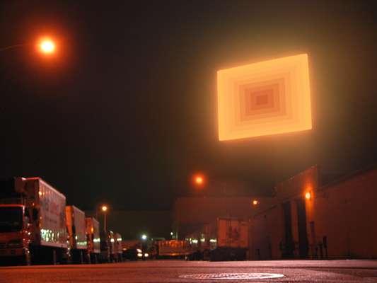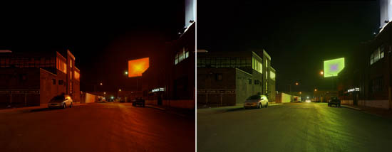 Called Color Shift, the installation “is an urban-scaled art project made by inputting a continuous stream of alternating colors into the FreshDirect video billboard, the largest in the country.” As such, it’s a kind of creative mis-direction of urban light pollution – a post-Duchampian optical relief in technicolor, throbbing through a dozen spectra across the roofs and walls of New York City.