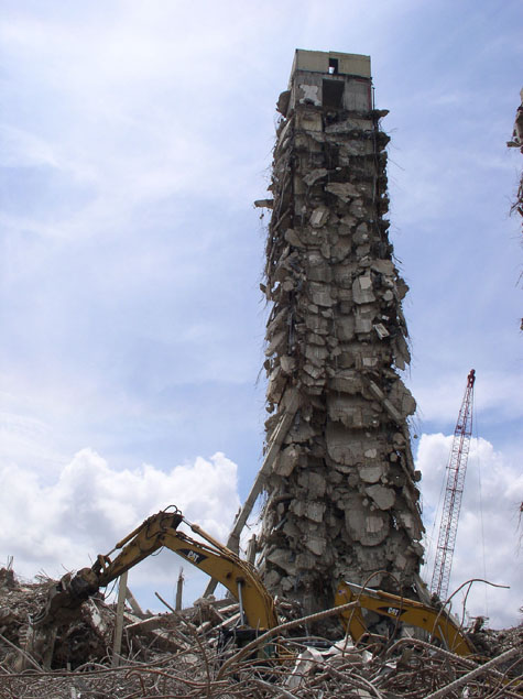 I’d imagine that this is probably an elevator shaft, or stairwell, as I’ve often seen those be the last remaining parts of a demolition like this.