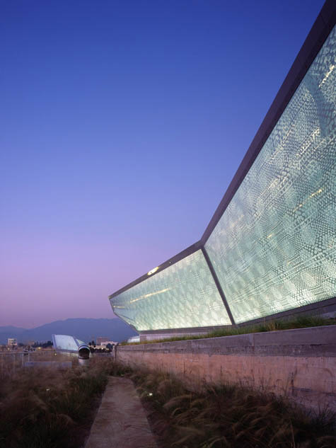Further, because the architects “wanted the skylight installation to demonstrate an integration of design disciplines: structure, architectural form, and graphic design,” they worked “in collaboration with graphic designer Bruce Mau, ARUP structural engineers and Foiltec technicians.”