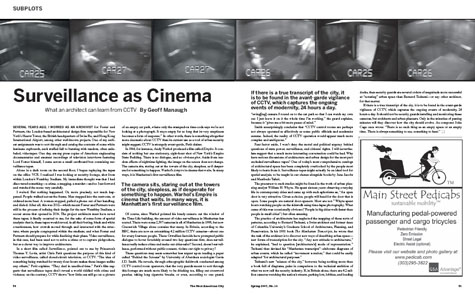 If you’re looking for something to read outside the internet, I’ve got a short article in this month’s issue of The Next American City about the use of video surveillance – CCTV – as a new, cinematic form of urban analysis.