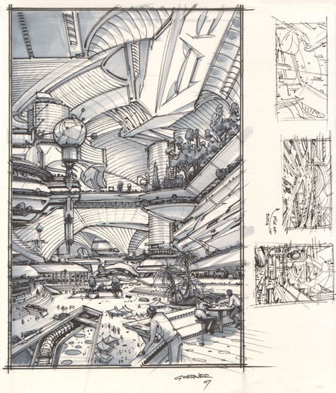 There’s then Mark Goerner, who’s worked on Constantine, Minority Report, The Terminal, and X-Men 2 (including Magneto’s plastic prison), among others. Check out this crashed ship-city, piercing the lunar surface, in both sketch and final versions.