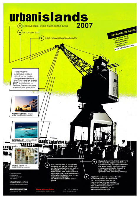 [Image: For a few heady weeks I actually thought I was going to be teaching at this thing… but no more. Alas. Still, though, how can you resist applying for a two-week architectural design studio in Sydney, Australia, themed around the spatial rehabilitation of a semi-derelict, post-industrial island, complete with “early convict settlement structures” and heavily incised sandstone foundations? More information, including how to apply, available here; larger, though low-res, version of the flyer available here. Have fun!].
