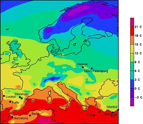 To illustrate the point, that article includes a somewhat cryptic climate map, produced by scientists at the University of Bremen. The map relocates Europe’s capital cities to the present region that most closely resembles their impending future circumstances.