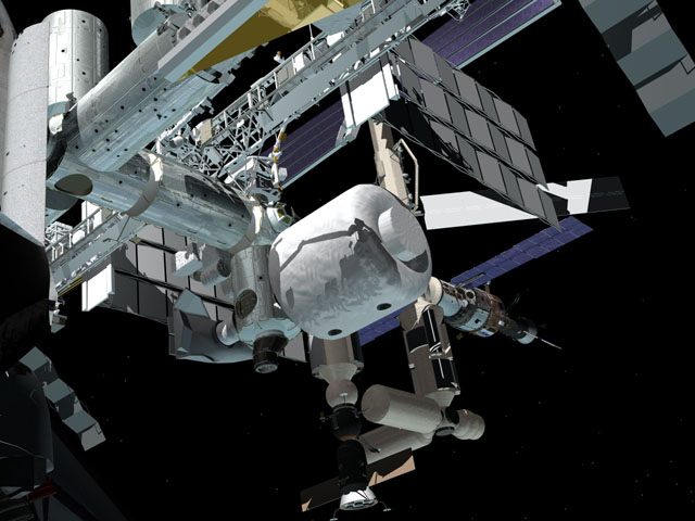 [Image: NASA’s TransHab module, attached to the International Space Station. TransHab designed by Constance Adams; image found via HobbySpace].