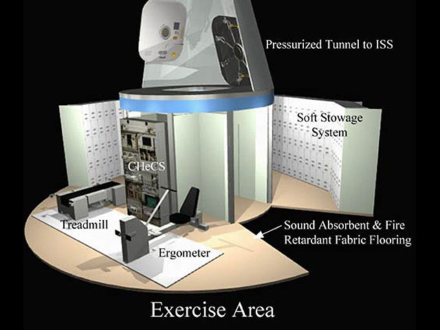 [Image: The TransHab, cut-away to reveal the exercise room and a “pressurized tunnel” no home in space should be without. Image via Synthesis Intl. (where many more images are to be found)].