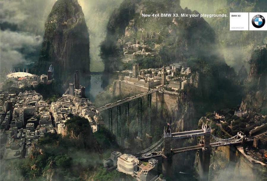 [Image: A BMW ad, showing us London geologically mixed, across a series of bridges and viaducts, with, say, Rio de Janeiro, Angkor Wat, and maybe… Macchu Picchu? View larger. Found via things magazine].
