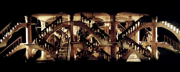In any case, Lord has physically constructed the architecture described by Borges; her interiors thus “intentionally evoke spatial and geometric confusion, where great pillars extend into infinity and endless staircases appear to intertwine like a three dimensional maze to form a ‘nonsense’ structure or architectural folly.”