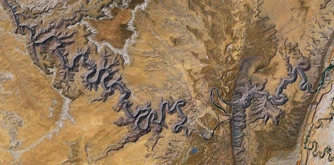 [Image: The Earth, as it appears from above, outside Mexican Hat, Utah: sliced by the great lobed canyons of a desert riverbed. I believe you’re looking down at Goosenecks State Park. Images collected via Google Maps. View bigger. Earlier: Fossil Rivers].
