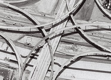 [Images: A truly awesome image of an elevated highway-house, architect unknown (if you know, please inform!); and some L.A. freeways, photographed by satellite].