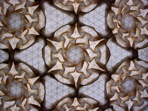 [Image: An example of origami tesselation, turning surface to structure, called “Count?” by Christine Edison – whose other work is simply unbelievable: check out “Triad back backlit,” for instance, or this set of her “favorite tesselations.” While you’re there, don’t miss “New Years Eve Tess” or “Blue Snowflake Tess.” Christine also has a blog where you can click around on other spectacular examples of folds and pleats to your heart’s content. Spotted via Eric Gjerde, who recently published a short booklet explaining how you, too, can produce similar foldings of local paper-space… Architects would do well to study origami’s spatial densification].