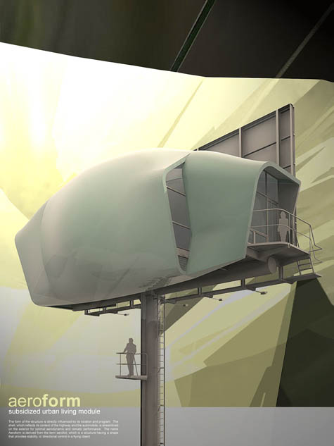 [Image: A project by Brendan O’Grady/nocturnal design lab, suggesting what an inhabited billboard mast might look like; view larger. For another such project see BLDGBLOG’s look at the awesome Single Hauz. O’Grady’s design was produced for, and won an award as part of, the 2007 KRob architecture competition; found via Archinect].