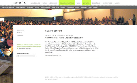 I’ll be down in Los Angeles next week to give a lecture at SCI-Arc on the night of Thursday, November 15. The talk is sponsored by Ed Keller’s new MediaSCAPES program, with the support of onMatter, and it should be a lot of fun.