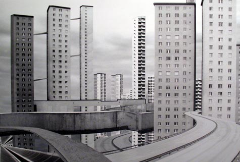 1. This photograph immediately reminded me of the highway in Buenos Aires that goes from the airport to the city. It was built during the military dictatorship. It winds through the buildings, so that you can see the city dwellers lives flash by you: their underwear hanging to dry, their sad houseplants in kitchen windows, a blue flicker of a TV pressing on a closed window…