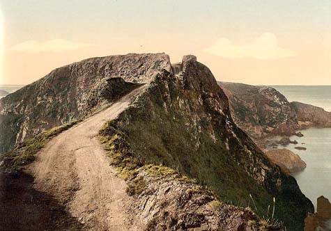 [Images: Castle in Llanstephan, Carmarthenshire; Petite Bot, Guernsey, Channel Islands; La Coupee, Sark, Channel Islands; Dixcart Bay, Sark; Sugarloaf Rock at Port St. Mary, Isle of Man; the coast at the Gouffre, Petite Bot, and the harbor at La Moye Point (3 images), Guernsey; via Old UK Photos].