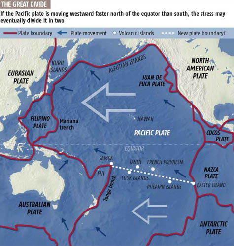 The northern half of the plate has been drifting west, into the Mariana subduction zone, nearly seven times faster than the westward drift of the southern half, creating a massive linear cramp of tectonic stress that may eventually snap altogether. Indeed, the scientists suggest that “several archipelagos in the south Pacific – running from Samoa to Easter Island – including the Pitcairn and Cook islands, and French Polynesia,” are evidence that this “future border,” as the scientists call it, has already begun leaking magma, producing tropical island chains.