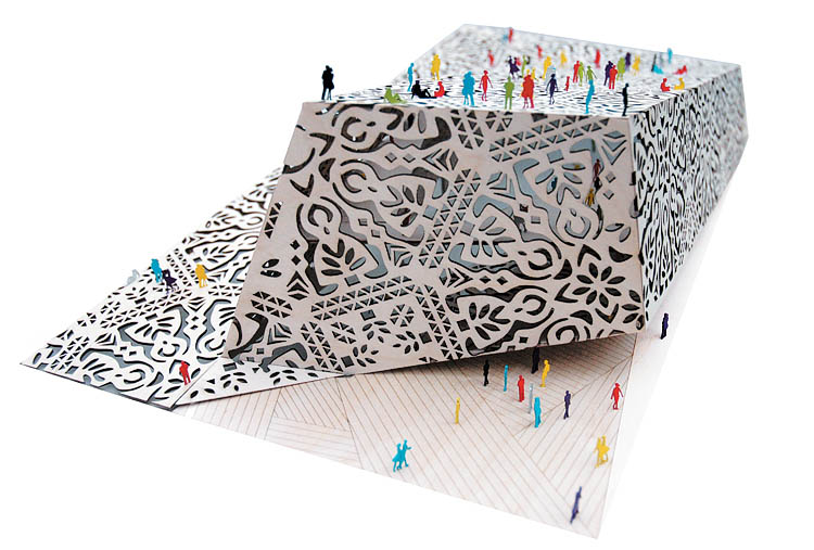 While the pattern design may be conceptually rooted in paper, what I see looking at the plan overall is my grandparents’ dining-room table from my childhood. It’s like the edge is being lifted up and everyone is being invited in to a quiet space in which they will somehow simultaneously feel both tiny and safe. That “shadowtastic” effect noted above will (hopefully) lend the effect of feeling simultaneously like a hiding space and a place of discovery (or was I the only one who liked to hide under tables as a child?).