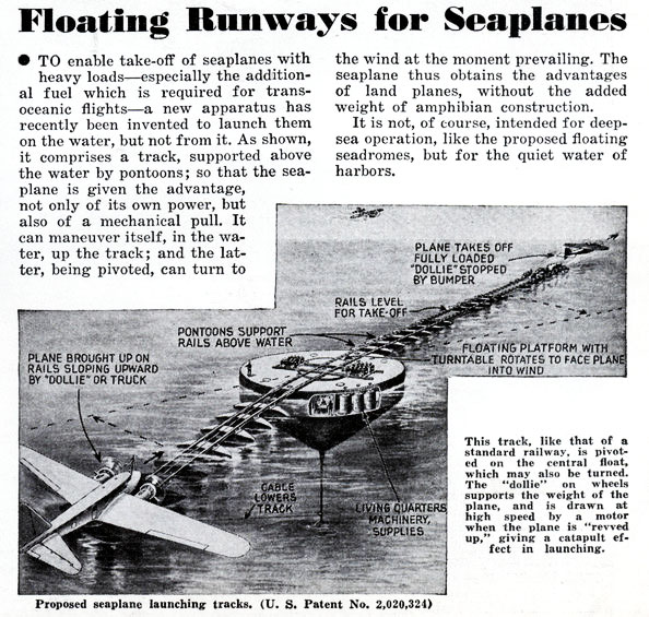 The design pictured below – for “a track, supported above the water by pontoons,” forming a sea-based airport on top of which planes could land – was published in Science and Mechanics back in 1936.