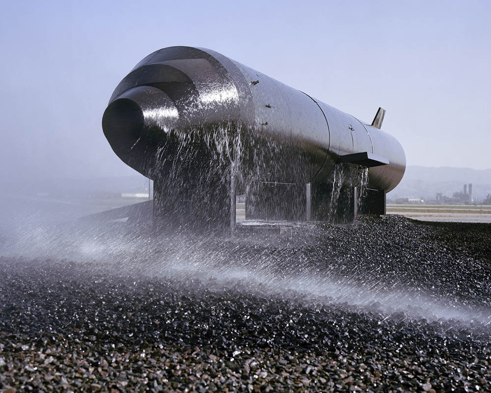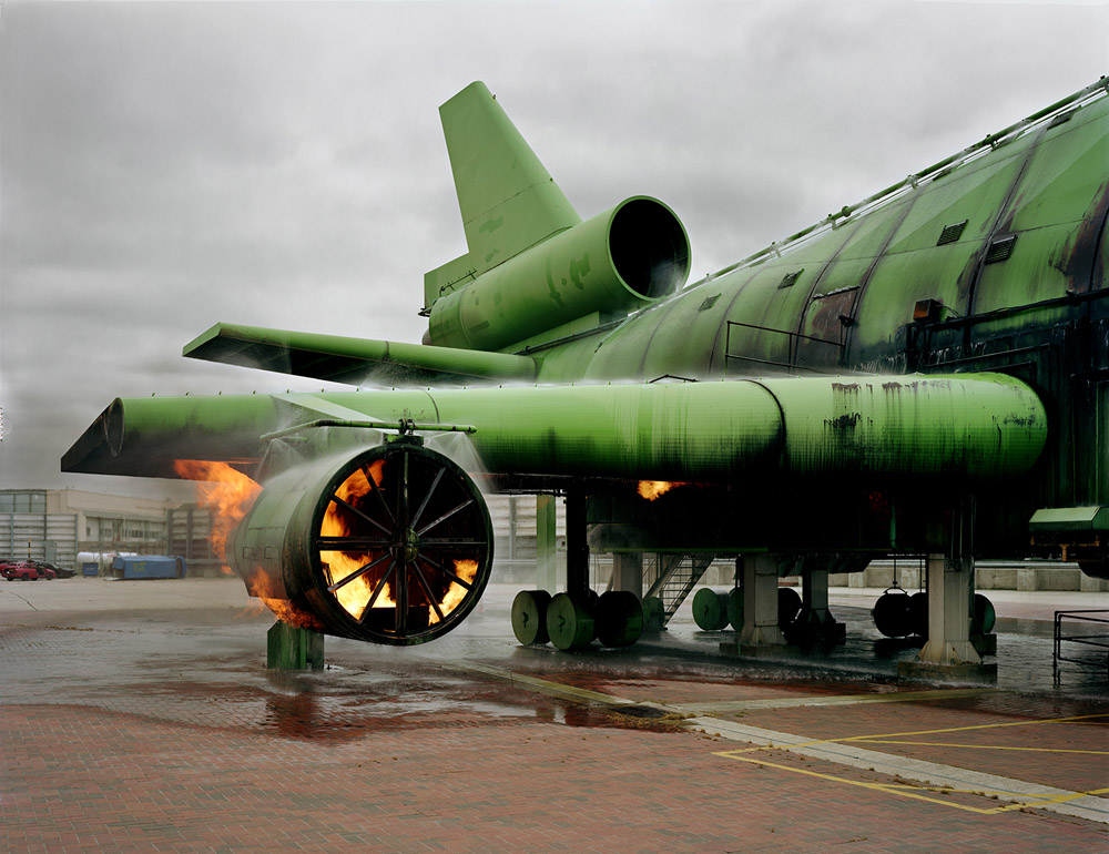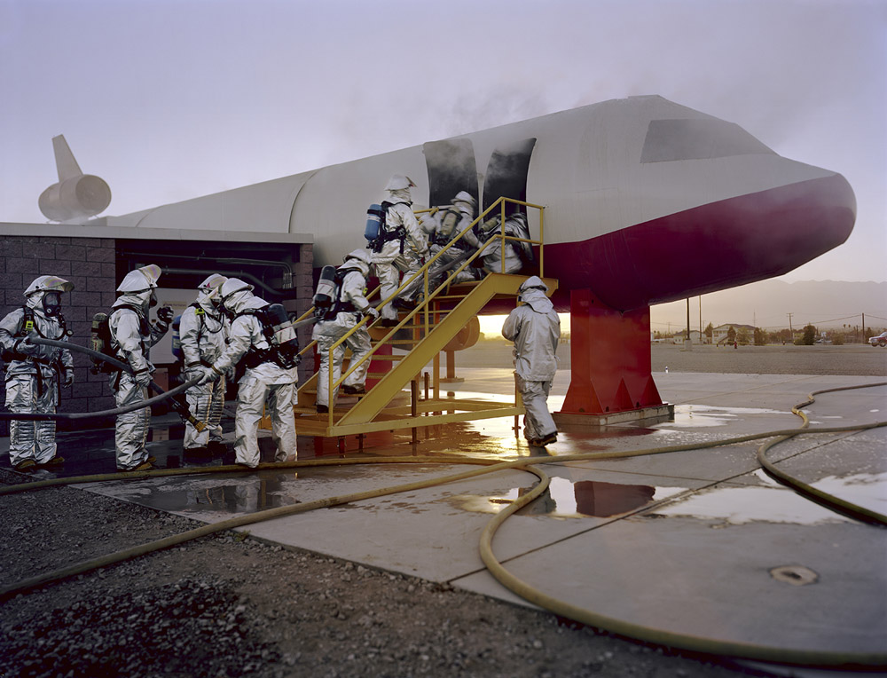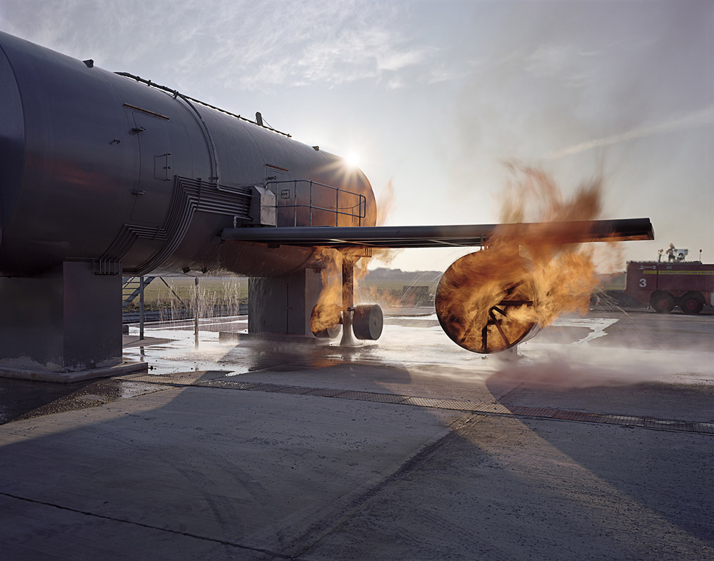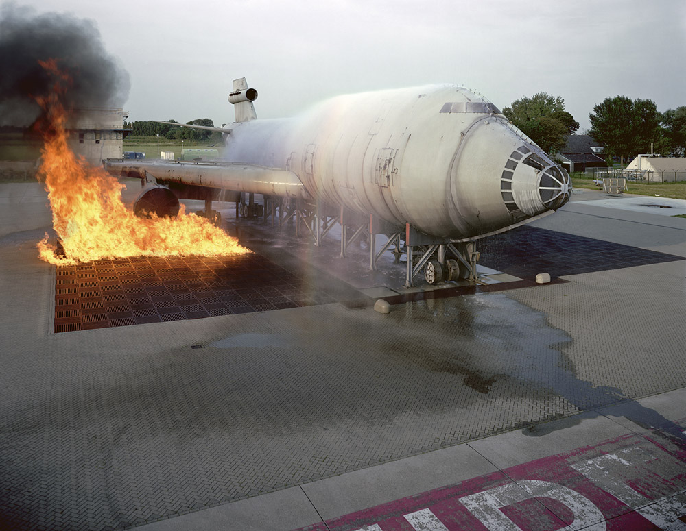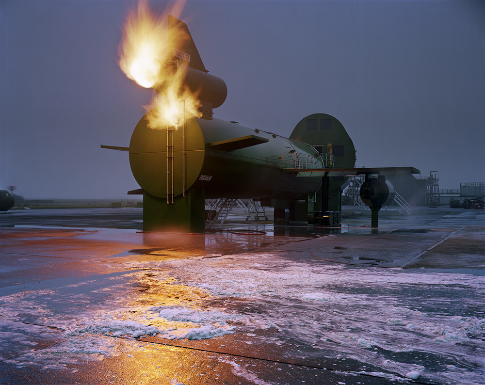The actual disaster is a moment of contingency and confusion. It’s all over in milliseconds. It’s hidden in a thick cloud of black smoke and you cannot even see it. Battles, ambushes, hijackings, air strikes, terrorism: it’s the same with all of these, too. But the catastrophe lives on before the fact and after the fact, as this spectacle. That’s why I wanted to photograph the air disaster simulators; they are the air disaster more than the thing itself. We have built in our airports these enormous, absurd, phallic structures with kerosene jets and water sprinklers. They are monuments to our own fear, made within the pared down, hyper-functional, green and black and grey symbolic order of militarized space.