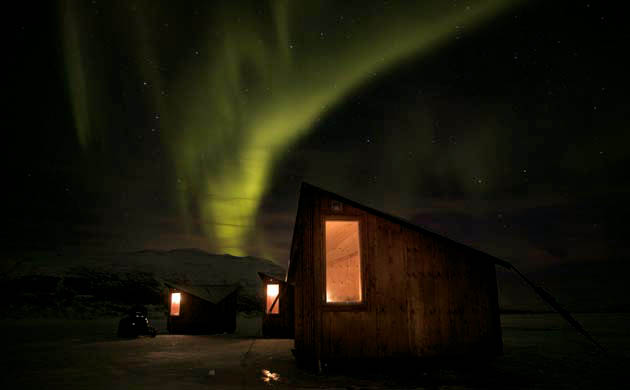 Each hut “is about six meters square and sleeps three comfortably on single beds. The best part is that by each bed is a resealable hole in the wooden floor, allowing guests to fish from the comfort of their down-filled sleeping bags.”