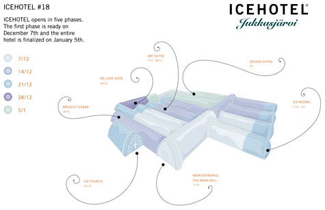 In the corridors, dividing walls are built in order to create rooms and suites. Ice blocks, harvested at springtime from Torne River, are now being transported into the hotel where selected artists from all over the world start creating the art and design of the persihable material.
