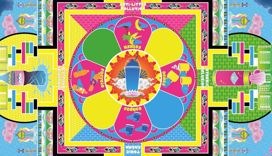 Jeffrey Inaba and C-LAB have created this mandala of consumption, refuse, and plastic waste, with one side dedicated to the “hydration compulsion” that helps puts millions of one-use bottles in places bottles aren’t meant to be.