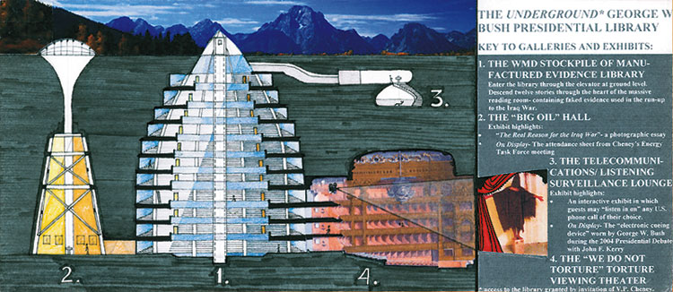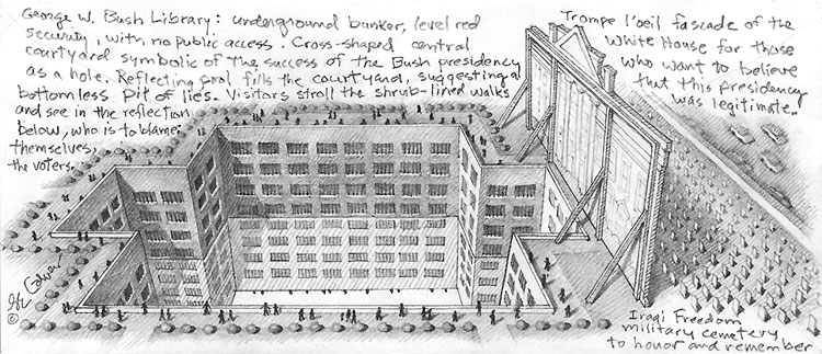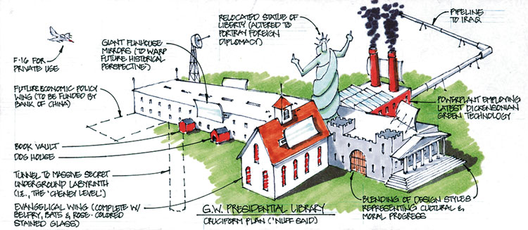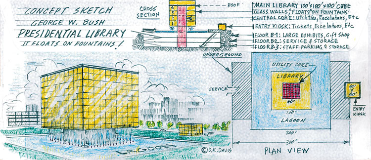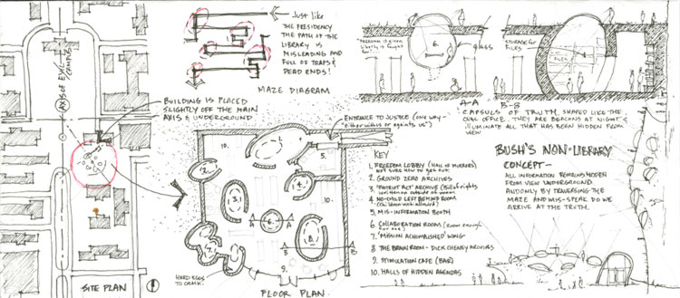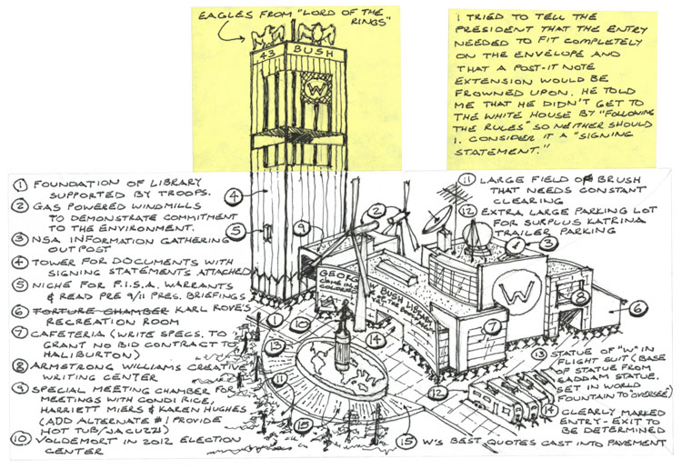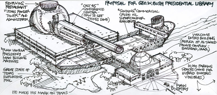 For the Chronicle of Higher Education‘s Back-of-the-Envelope Design Contest, for which they “asked readers to sketch their own visions for the George W. Bush Library,” Scott Carlson wrote: