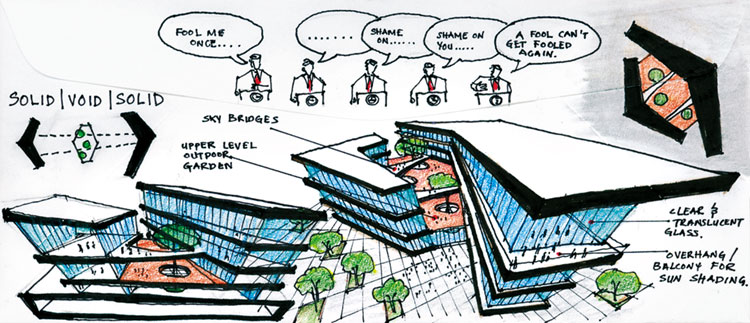 We thought that Chronicle readers would have their own ideas about how that building should be designed, and we invited people to send in designs on the backs of envelopes. About 120 people sent in sketches that were good, bad, serious, humorous, abstract, or really angry. Their designs took the form of toilets, bunkers, crosses, and W’s, some crudely drawn and some very elegant.
