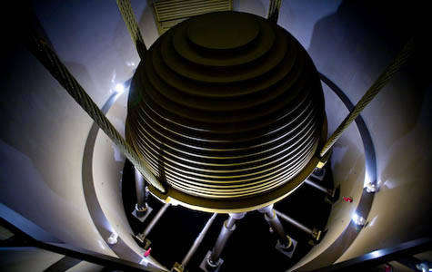 As earthquake waves pass up through the structure, the ball remains all but stationary; its inertia helps to counteract the movements of the building around it, thus “dampening” the earthquake.