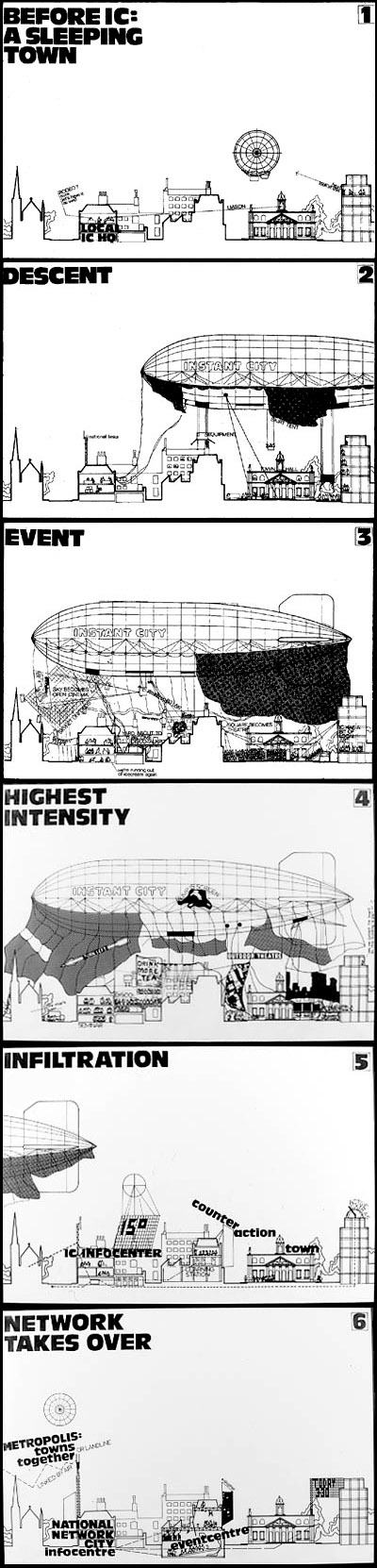 [Image: The Instant City at work; diagrams by Peter Cook/Archigram. An original interview with Peter Cook appears in the forthcoming BLDGBLOG Book].