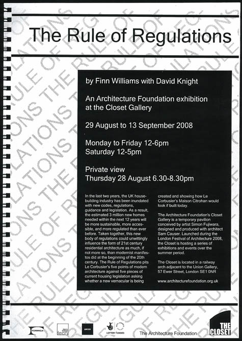 An interesting architectural exhibition, put togther by Finn Williams and David Knight, closed today in London. Called The Rule of Regulations, it looked at what effect today’s building codes and zoning regulations might have if retroactively applied to an historic structure such as Le Corbusier’s Maison Citrohan.