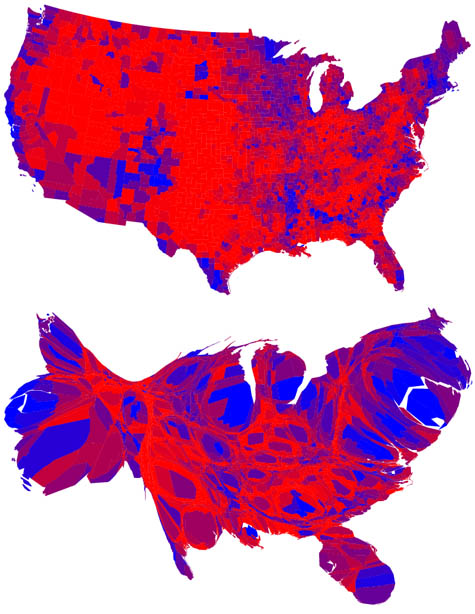 [Images: From the fascinating series of electoral maps produced by M. T. Gastner, C. R. Shalizi, and M. E. J. Newman after the 2004 U.S. presidential election].