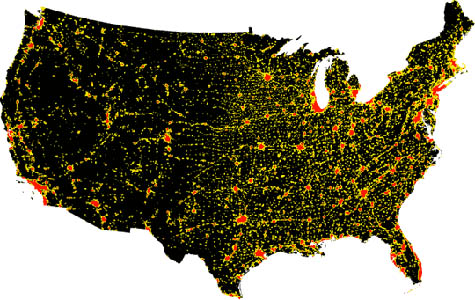 [Image: The population density of the United States, ca. 2000, via Wikipedia].