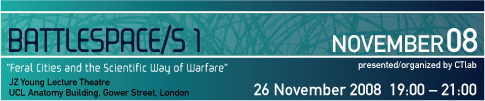 You'll be happy to know that the Battlespace/s public lecture will be A/V captured, and digitally edited to streaming video format for online viewing. I'm told that that that could take up to seven days to complete, post-event. If it's hosted on UCL servers, we'll at least make sure that the link is made available here and at the CTlab website.
