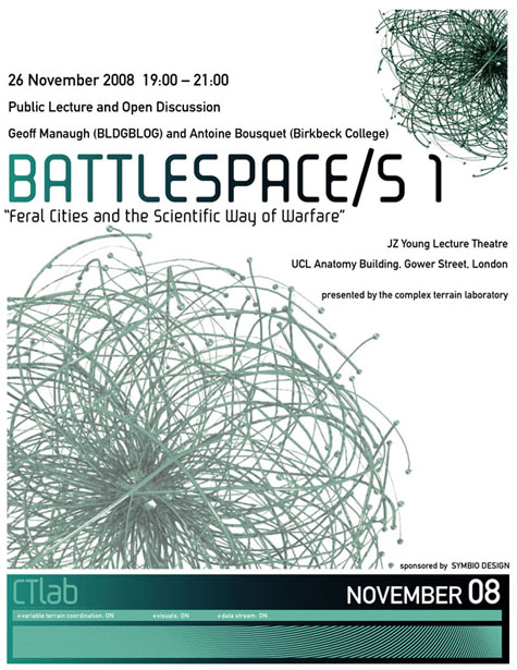 Antoine and I will both be giving short talks, followed by a general Q&A. The event is wide-open to the public, so please feel free to stop by. At the very least, you’ll get an early preview of Antoine’s forthcoming book – in which he introduces the term chaoplexic warfare in a survey of everything from ant “swarms” and the use of 18th-century battlefield metaphors to the distributed geographies of the Russian mafia, the Medellín drug cartel, and Al-Qaeda – and that’s already quite a lot right there.