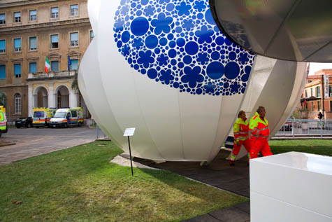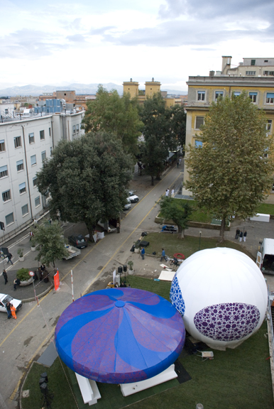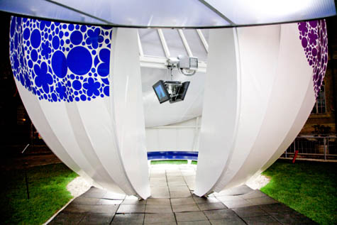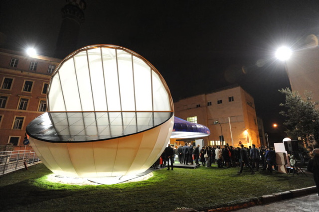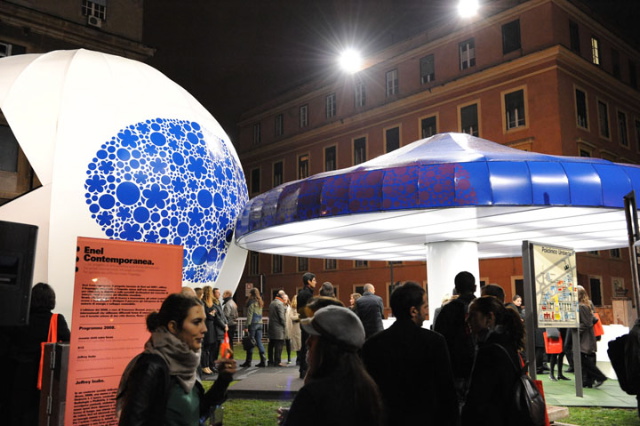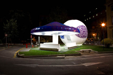 Jeffrey Inaba of Inaba Projects has a new pavilion on display now in Rome, sponsored by Enel, Italy’s largest utilities provider. Because of that sponsorship, Inaba “wanted to use numerous forms of alternative energy applications,” but decided, in the end, to apply “just one that was highly productive and cost effective.” The pavilion is thus solar-powered – Inaba describes it as an “Alice in Wonderland mushroom meets solar-ray chomping Pac-Man.”