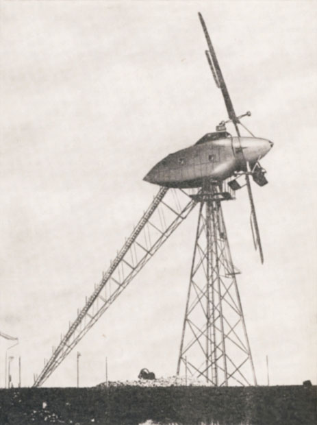 As if anticipating BLDGBLOG’s recent look at infrastructural domesticity, Putnam points out that “a streamlined house” containing generators was held aloft behind the turbine – but this “house” also offered a temporary place of rest to the maintenance workers who checked up on the turbine’s workings. Accessible via a long flight of stairs, this airborne space added a small touch of domestic comfort to an otherwise industrial piece of machinery in the sky.