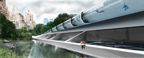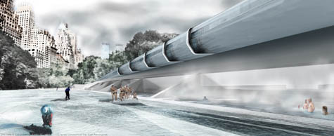 These above-ground pipes of water – like hydro-boulevards, or one might say the hydrological Haussmannization of Manhattan – are less an actual proposal for construction than a sort of architectural dream: the city cross-cut by amniotic utopias through which people can wander at all hours of the day.