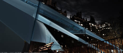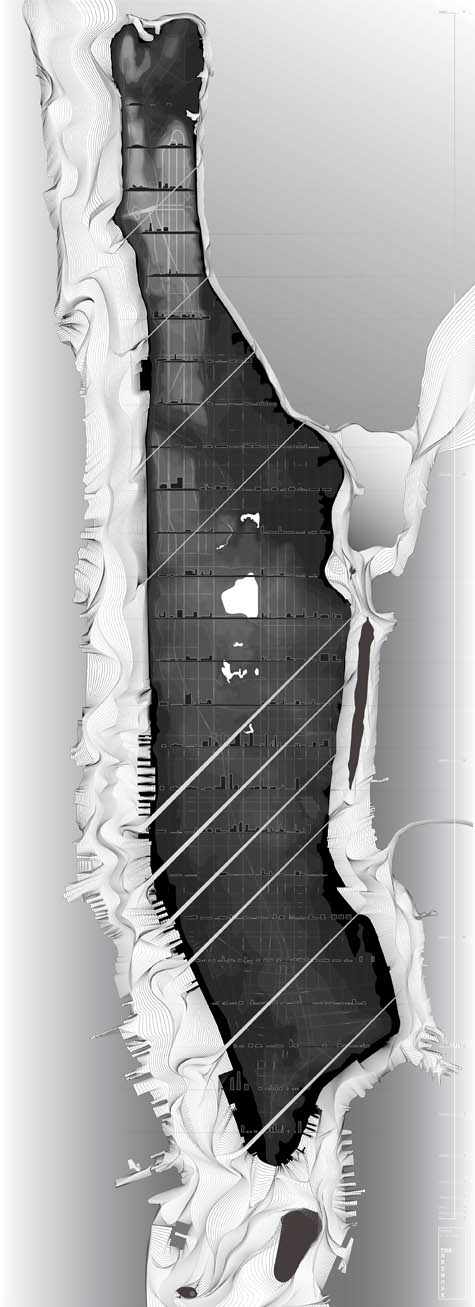 For her thesis project at Rice, Chin proposed ten “waterscrapers” that would slice across the urban space of Manhattan, cutting through buildings, through parks, and through the urban grid itself, forming strange aquatic intersections with the city.