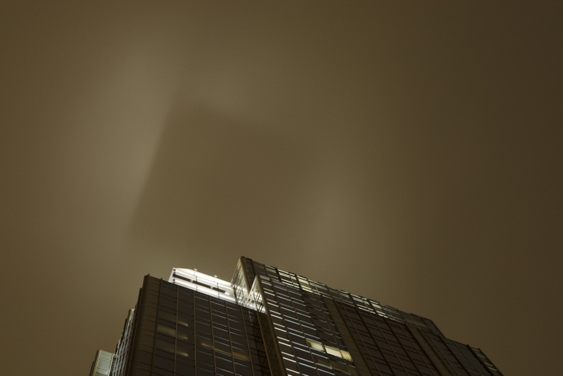 After all, there would seem to be serious architectural possibilities here. On foggy nights, or humid nights, or cloudy nights, you transform the sky into a trompe l’oeil painting, a cinematic oculus, a new ceiling, a kind of dream-valve above the city.