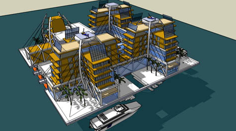 I’m thinking a village of stacked residences around the outside of the square, with a stepped pyramid of commercial enterprises in the center, with food gardens on the steps. Solar collectors of various kinds around the outside of the structure. Or get power from tidal forces.