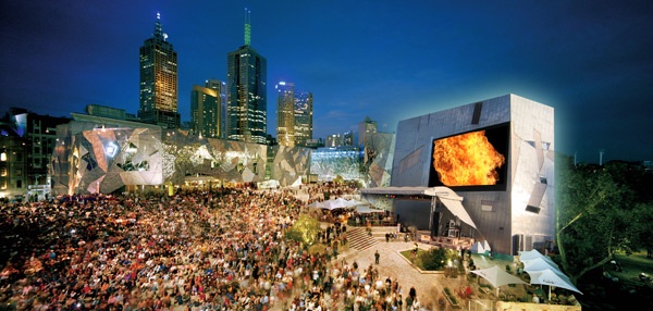 [Image: A rendering of a “media facade” in action, in Melbourne’s Federation Square; image via Swissnex].