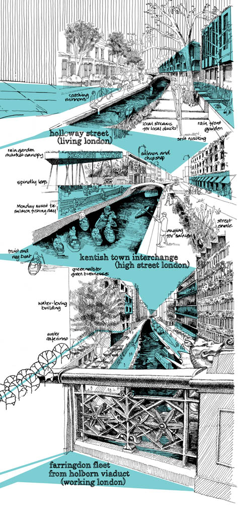 Many of London’s streets now incorporate new watercourses: in residential areas, these channels have become the focus for activities from canoeing to waterside promenading. In Kentish Town the Fleet River has become London’s first floating market.