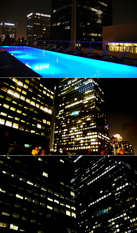 Standing up there in the darkness, looking at bank towers and real estate investment firms, individual offices lit from within (and even whole hallways, stretching horizontally into the sky before disappearing into themselves through a trick of perspective), the 16th, 17th, and much-higher stories of the city all visible to us like an architectural section, you could narrate a kind of local micro-history of nighttime spaces in LA.