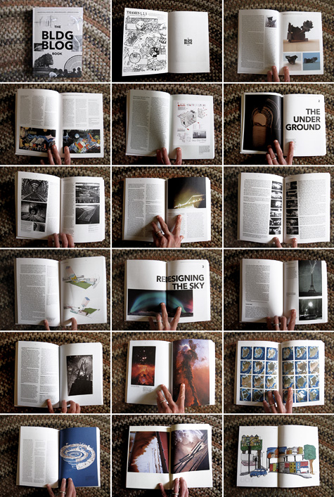 [Image: The BLDGBLOG Book, published by Chronicle Books, designed by MacFadden & Thorpe, and illustrated by Brendan Callahan. Visible here are images by Joe Alterio, Alex Dragulescu, Sir Peter Cook/Archigram, Lateral Architecture, Michael Cook, Stanley Greenberg, Alexis Tjian, myself, Joel Sanders, Örvar Atli Þorgeirsson, NOAA et al., Lebbeus Woods, NASA et al., Ron Blakey, the USGS, David Maisel, and Brendan Callahan].