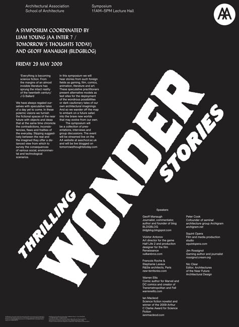 [Image: Thrilling Wonder Stories: Speculative Futures for an Alternate Present at the Architectural Association. Poster design by Wayne Daly, with art direction by Zak Kyes; view larger for more info].