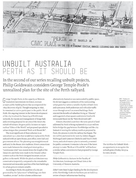 Amongst the huge variety of things I’ve come across in the last few days while researching Australian architecture is the AA Prize for Unbuilt Work – particularly the historical series “Unbuilt Australia,” published by Architecture Australia.