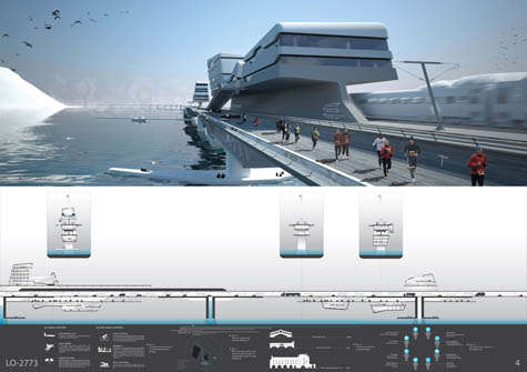 Public and cultural programs intermittently rise above the bridge while research and education programs hang below the rail/road. Significant programs include a new United Nations headquarters, World Water Council headquarters, an Arctic Museum, and extensive oceanographic and meteorological facilities.